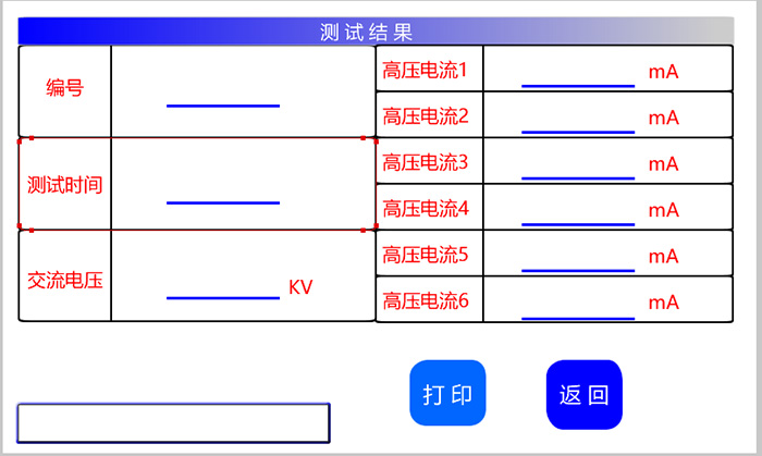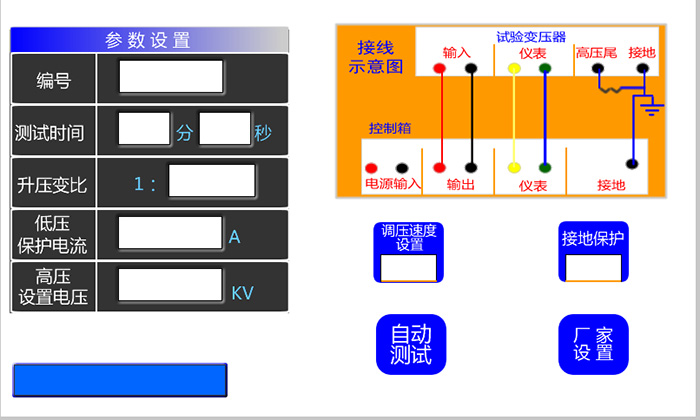 1、按照主界面(如圖3)選擇耐壓試驗。按接線(xiàn)原理圖連接好引線(xiàn),并將變壓器和控制箱可靠接地,控制箱的接地端必須接到變壓器的接地端,請勿直接接地線(xiàn),防止控制箱接地而變壓器沒(méi)有良好接地。 2、試驗前,檢查各部位的接線(xiàn)是否接觸良好,并檢查控制箱的輸入電壓是否為220VAC; 3、打開(kāi)電源開(kāi)關(guān),接通電源,顯示屏顯示出主菜單如圖2, (1)編號:作為測試打印、保存查詢(xún)的標識; (2)測試時(shí)間:根據實(shí)際測試進(jìn)行設置 (3)升壓變比:根據外接變壓器可更改,變比值為儀表電壓:輸出電壓, 如儀表電壓100V,輸出電壓100KV,變比就設為1:1000; (4)保護電流:控制箱輸出的電流保護上限值; (5)設置電壓:即為實(shí)驗電壓,最高100KV。 (6)自動(dòng)測試:開(kāi)始實(shí)驗按鍵。 (8)廠(chǎng)家設置:有密碼保護,廠(chǎng)家人員調試電壓電流用。 4、設置好參數后,觸摸啟動(dòng)按鍵,再次確認后即開(kāi)始測試,測試過(guò)程中按下急停按鍵會(huì )停止測試,聽(tīng)到交流接觸器跳開(kāi)切斷電源。 5、試驗完畢后,電壓會(huì )自動(dòng)降至零位,然后斷開(kāi)交流接觸器,此時(shí)可選擇打印測試結果或返回主菜單,如需解開(kāi)試驗引線(xiàn)請關(guān)閉電源。